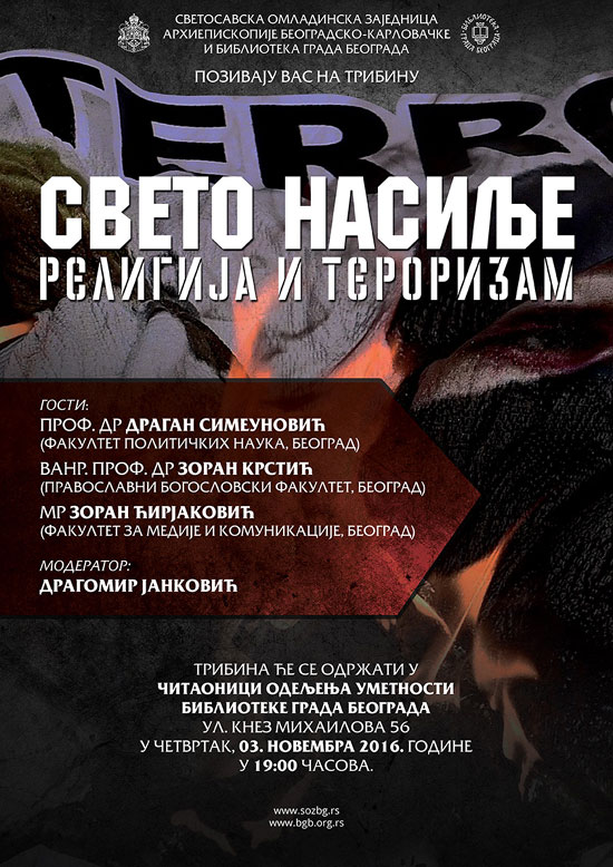 Позивамо вас, да у четвртак, 3. новембра 2016. године, у 19 часова, у читаоници Одељења уметности Библиотеке града Београда (Кнез Михаилова 56) присуствујете трибини на тему „Свето насиље: религија и тероризам“