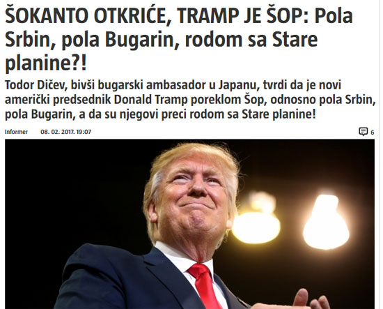 Тодор Дичев, бивши бугарски амбасадор у Јапану, тврди да је нови амерички председник Доналд Трамп пореклом Шоп, односно пола Србин, пола Бугарин, а да су његови преци родом са Старе планине!