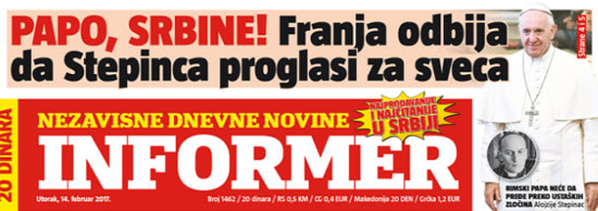 Информер: Папо, Србине – Фрања неће ни да чује да Степинца прогласи за свеца