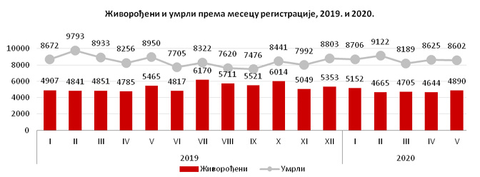 Број умрлих у Републици Србији у периоду јануар-мај 2020. године износио је 43 244 и, у односу на исти период претходне године, када је број умрлих био 44 604, бележи се пад од 1 360 или за 3,0%