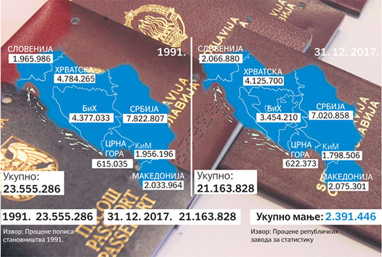 Никада у новијој историји на овим просторима није живело мање људи него данас, што употпуњује и податак да су лане рођене 64.894 бебе, а умрле чак 103.722 особе