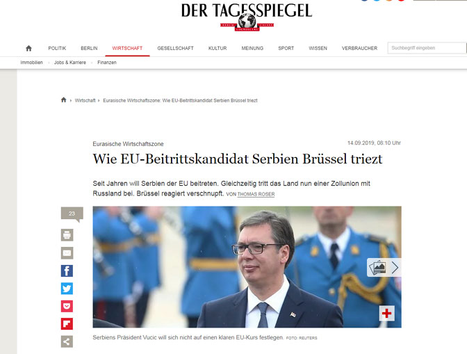 Српско артистичко јахање на два коња никако не наилази на одушевљење у Бриселу. Напротив: међу партнерима из ЕУ интензивно очијукање Београда са Москвом жање критике, пише берлински дневник Тагесшпигел