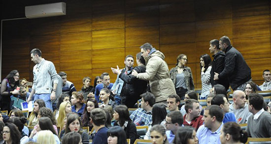 Пред почетак предавања шефа Делегације ЕУ у Србији Мајкла Давенпорта на ФПН-у, троје присутних је протестовало због његовог доласка.