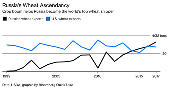 (Bloomberg, 13. 11. 2017) Руски извоз пшенице почео је да цвета почетком овог столећа, када су некадашња колективна газдинства из совјетског периода замењена приватним власништвом над плодном земљом, а пољопривредници добили прилику да се упознају са савременом светском технологијом