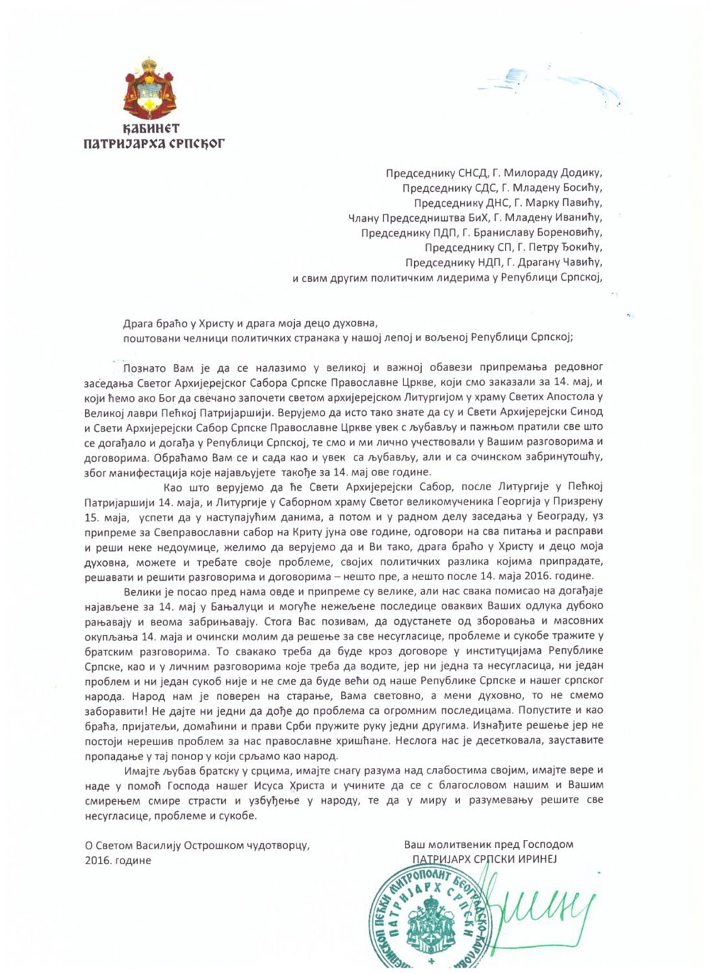 Патријарх српски Иринеј јавно је позвао политичке лидере Републике Српске да не деле народ и да РС не чине жртвом своје неслоге, већ да проблеме и несугласице реше разговором, братским договором и хришћанским смирењем.