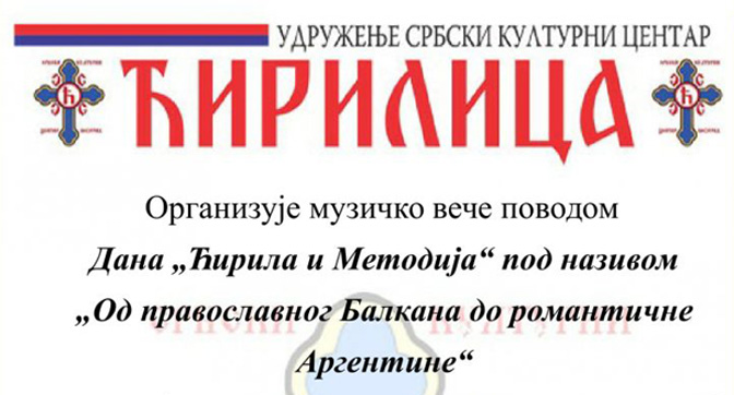 Уочи светих Ћирила и Методија, 23. маја 2019. године у 19 часова, у СКЦ „Ћирилици“ (Београд, Скерлићева 12) одржаће се музичко вече „Од православног Балкана до романтичне Аргентине“