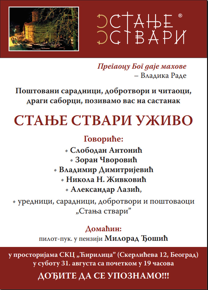 Позивамо вас на састанак СТАЊЕ СТВАРИ УЖИВО, који ће се одржати у просторијама СКЦ „Ћирилица“ (Скерлићева 12, Београд), у суботу 31. августа са почетком у 19 часова