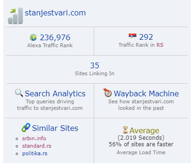 Ваш и наш сајт тренутно је на 292. месту на ранг листи свих сајтова који се посећују у Србији