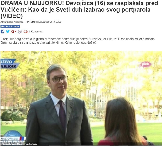 Након нејасног наслова читалац сазнаје да се текст заправо у потпуности тиче Грете Тунберг, еколошке активисткиње из Шведске (где је стицајем околности био и Вучић)