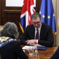 Амбасадорка Велике Британије на састанку с Александром Вучићем носила мараму с украјинским мотивима и стиховима украјинске химне „Изгинуће наши непријатељи, као роса на сунцу“