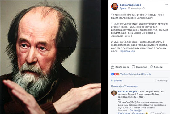 Познати публициста и творац синтагме „руско пролеће“ Јегор Холмогоров на свом Фејсбук профилу набраја десет разлога због којих је руском народу неопходан споменик Солжењицину